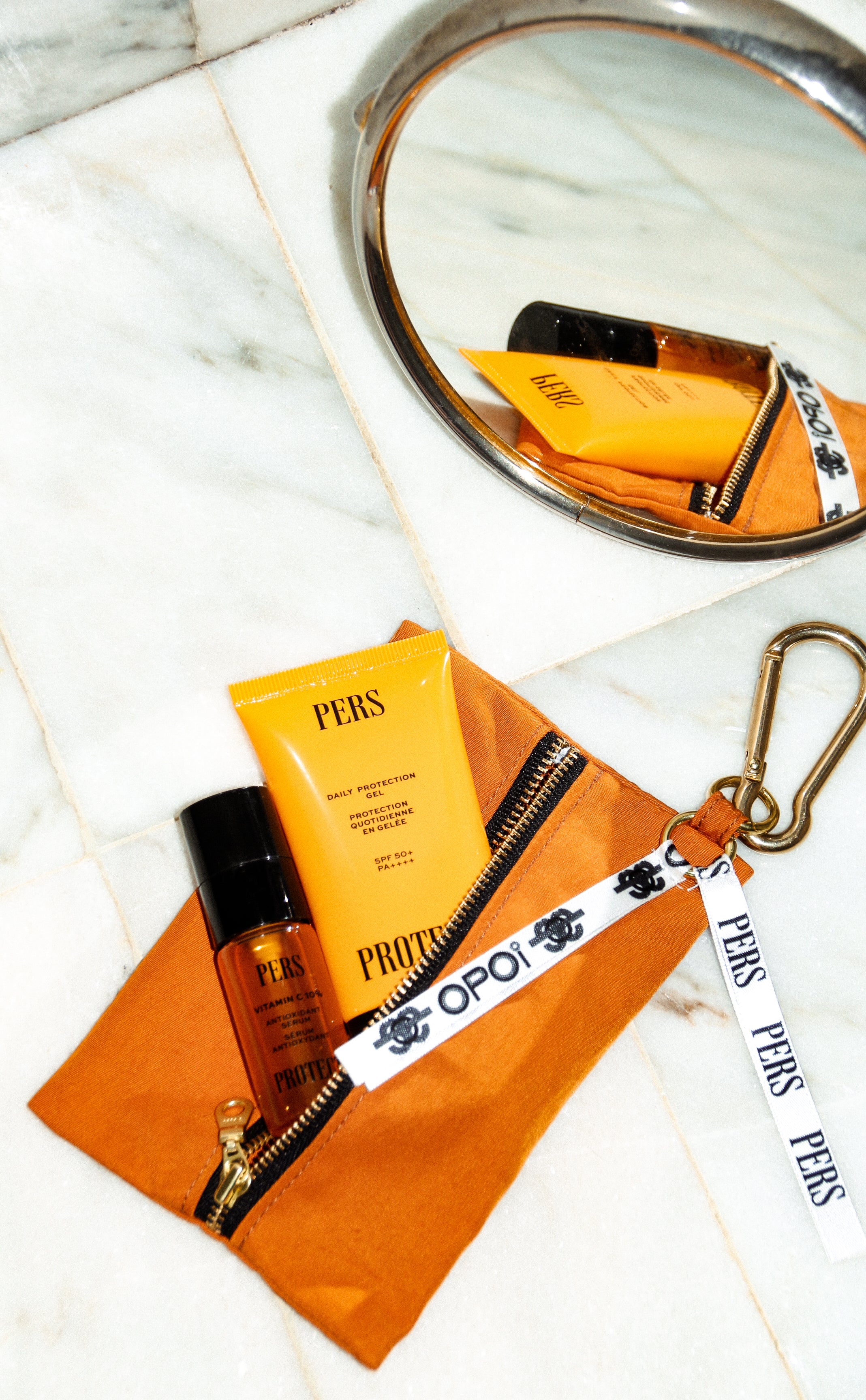 Glow on the GO est le nouvel indispensable beauté sport et voyage né de la collaboration entre PERS et OPOI. Pensé comme un accessoire du quotidien, ce keycharm nomade se fixe facilement à n’importe quel sac, grâce à son mousqueton cuivre premium. Compact, élégant et ultra-pratique, il accompagne chaque déplacement pour garder l’essentiel de la routine PERS toujours à portée de main.